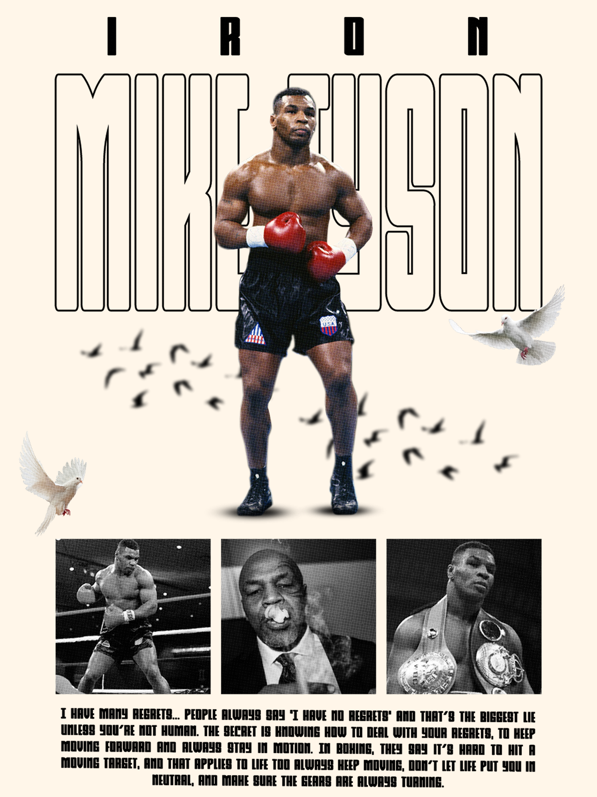 Eu tenho muitos arrependimentos... as pessoas sempre dizem "eu não me arrependo de nada" E isso é a maior mentira, só se você não for humano. O segredo é saber lidar com seus arrependimentos, continuar em frente e sempre se manter em movimento, no boxe dizem que é difícil acertar um alvo em movimento, e isso pode ser levado para a vida sempre se manter em movimento não deixar a vida te colocar em ponto morto e manter as engrenagens sempre funcionando.