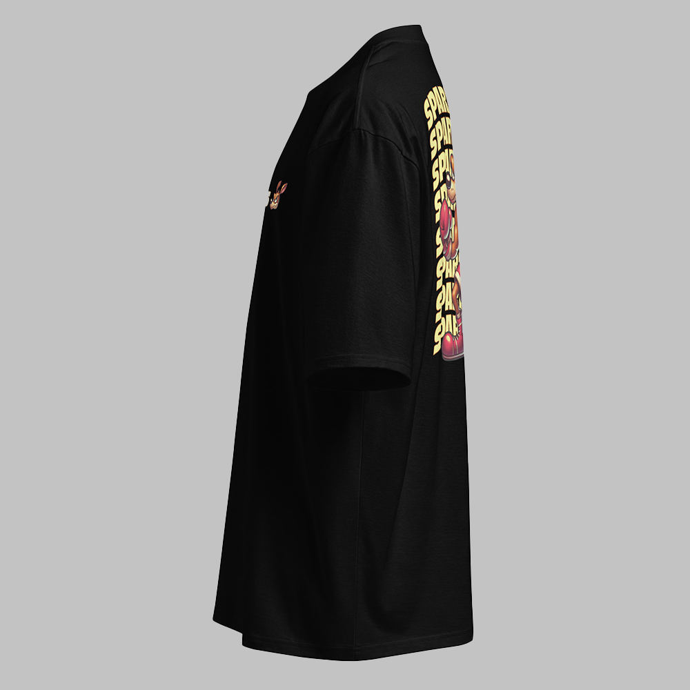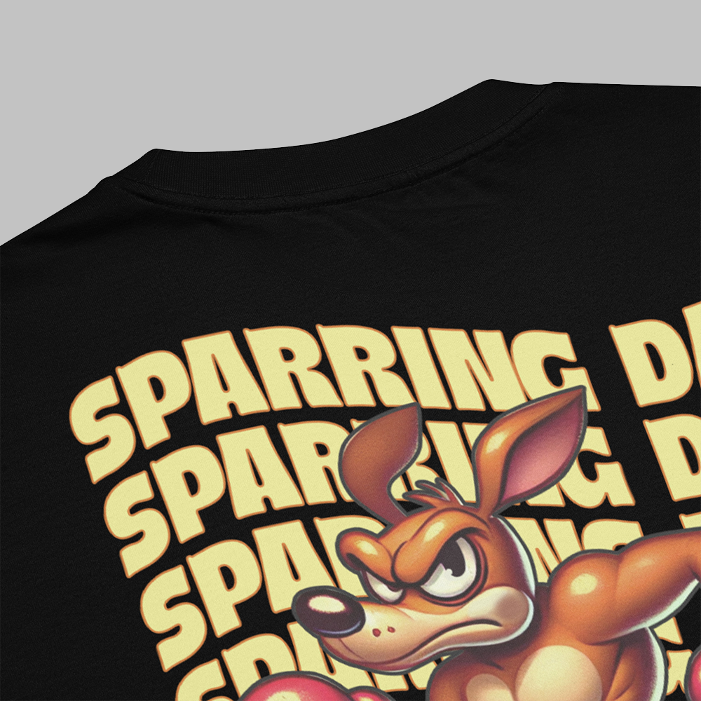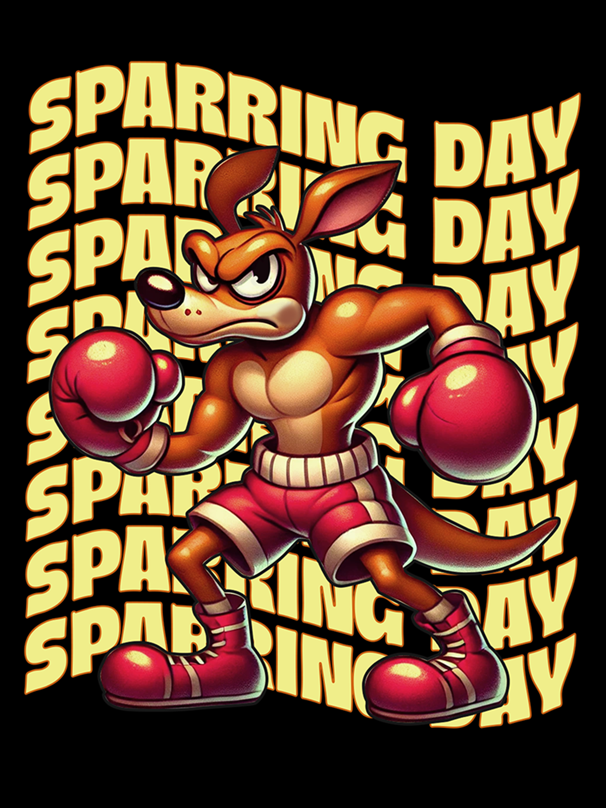 Desenvolvemos um personagem único, meio canguru, meio cachorro, forte, expressivo e com um visual exclusivo que carrega toda a atitude dessa estampa. Ao fundo, o “Sparring Day” se repete inúmeras vezes, simbolizando o que existe tanto no jogo quanto na luta: a repetição incansável. Porque é assim que a gente evolui tentando, errando, repetindo… até ficar bom de verdade.